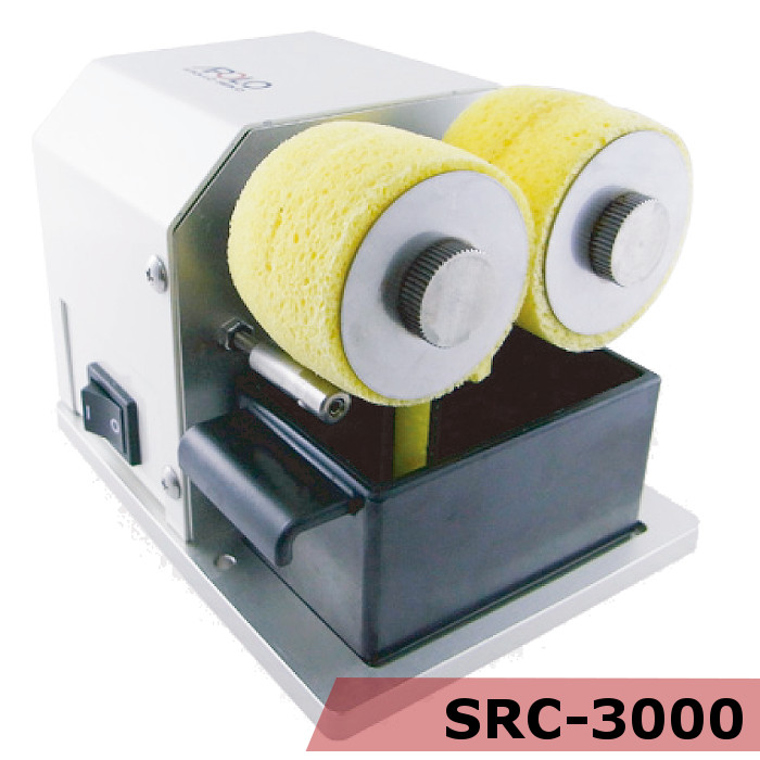 The SRC-3000’s wet sponges rotate in one direction to clean the iron tip. Soldering material and debris drop into the reservoir below for easy clean-up.